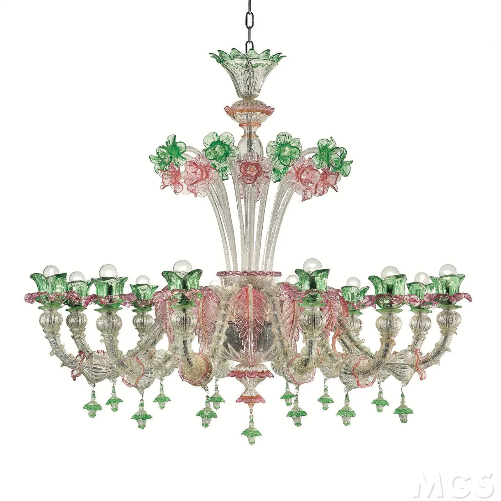 Wunderschöner Kronleuchter in Kristall und Silber mit rosafarbenen und grünen Glasverzierungen, schönen und besonderen Blütenschalen.