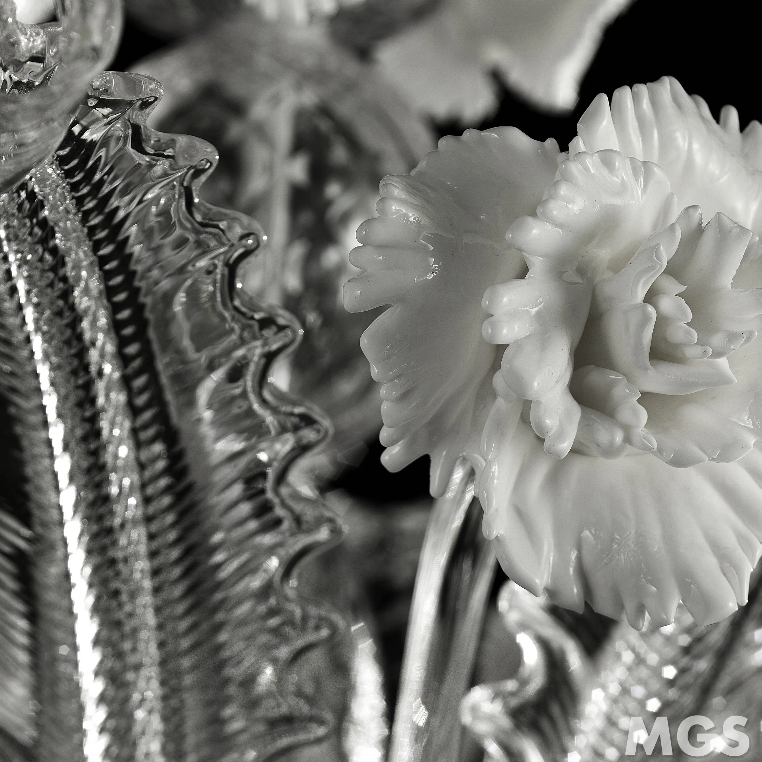 Kristall-Kronleuchter mit Blumen, Anhänger und andere Details in geschmolzenes Glas weiß.